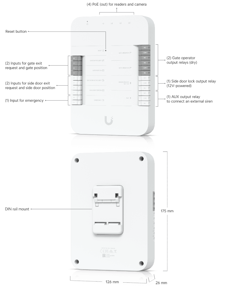 •Connect up to four UniFi Access readers or UniFi Protect cameras