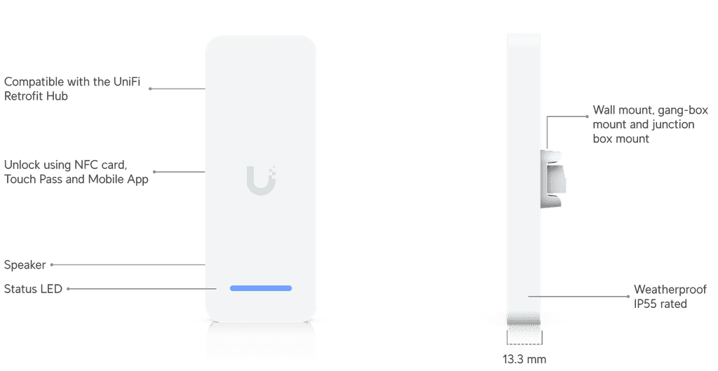 Indoor/outdoor OSDP reader with NFC Card and Touch Pass support, compatible with the UniFi Retrofit Hub using existing cabling.