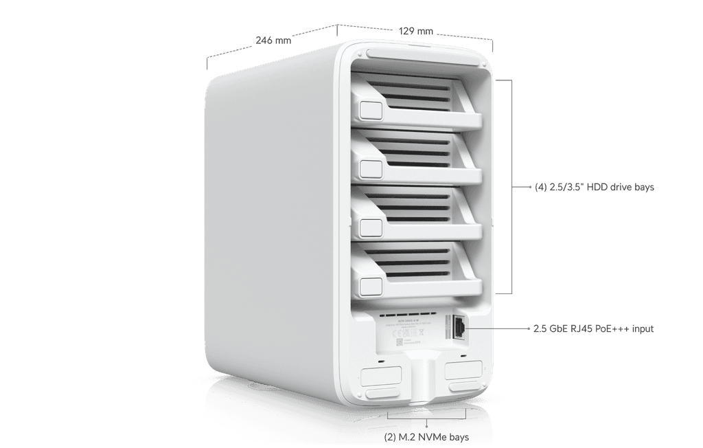 UniFi Network Attached Storage with (4) 2.5/3.5" HDD bays, (2) M.2 NVMe SSD cache slots, 2.5 GbE networking, USB-C connectivity, and an included PoE+++ adapter, all in a compact footprint.