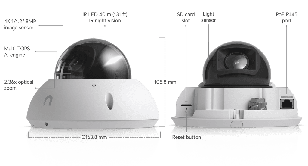 Ubiquiti (UVC-G6-Pro-Dome-W) Ubiquiti G6 Pro Dome, White,All-Weather Vandal-Proof 4K PoE+, Multi-TOPS AI,2.36x Optic Zoom, 1/1.2' CMOS Sensor, IR Night VIsion,*Avail for Deal Reg*